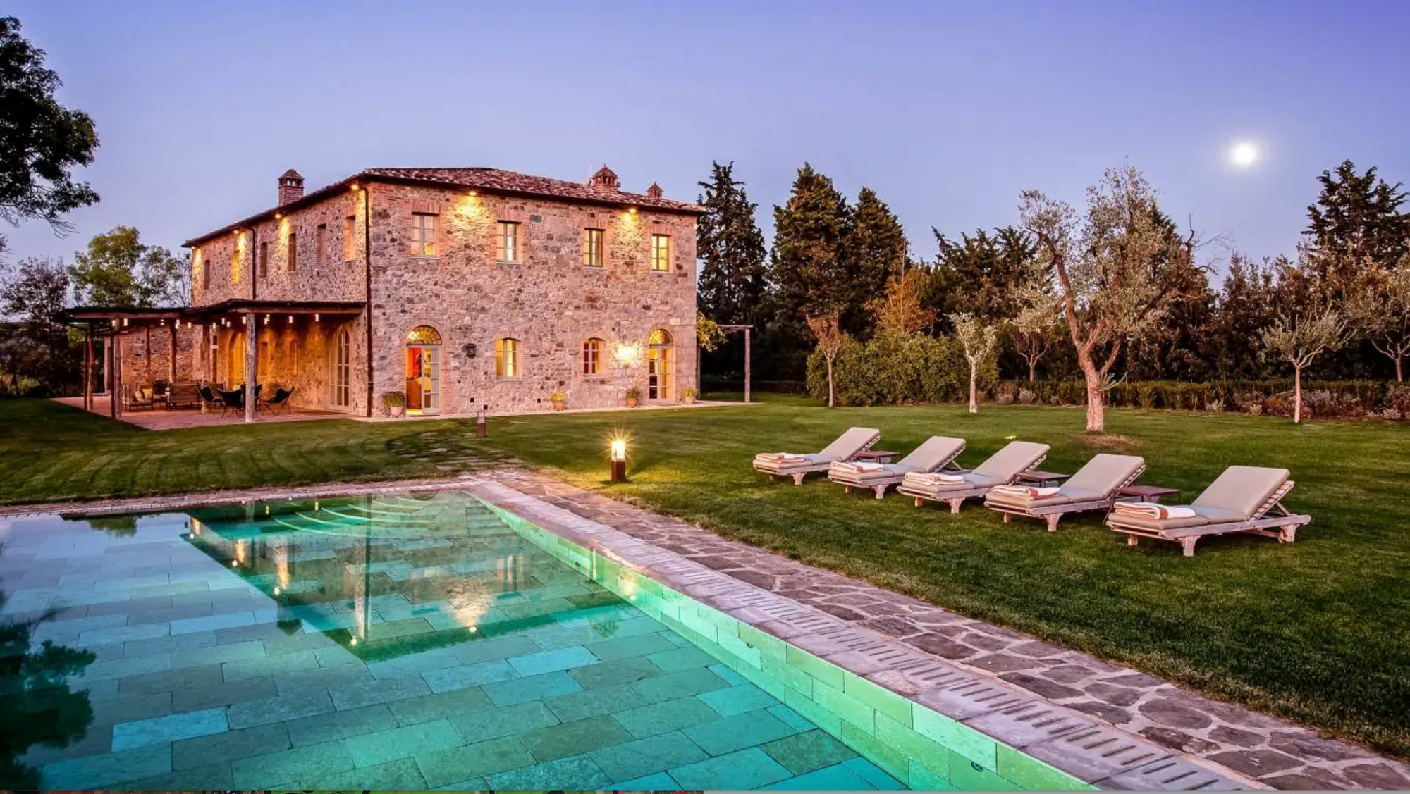 This charming country manor will elevate your luxury Tuscan holiday by leaps and bounds. Just four miles from extraordinary gastronomic experiences and picture-perfect medieval villages, Villa Biondi offers the utmost immersion into Italian living. An original fireplace sets the scene for cozy nights in or downtime between activities, while ultra-plush neutral sofas and wingback chairs with playful patterning add a modern edge to the timeless space. The natural wood veranda is a lovely extension of the authentic stone facade. Enjoy a dip in the heated pool while marveling at the lovely mountain views.