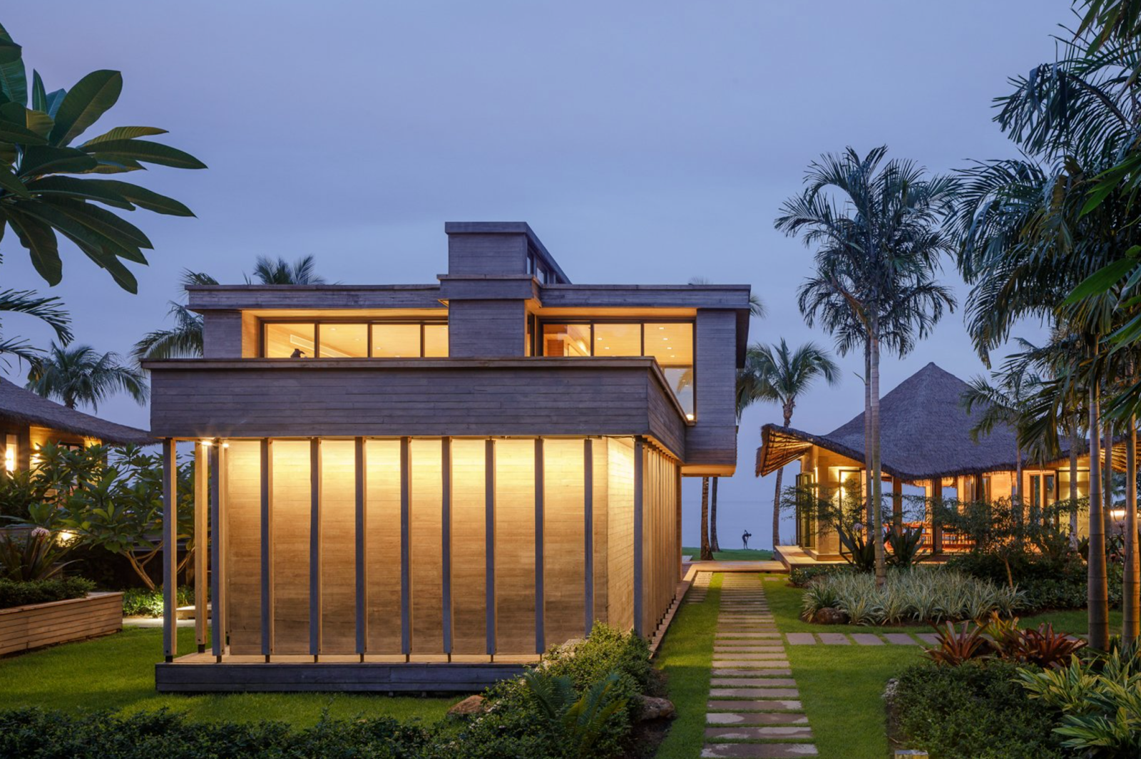 The layout features discreetly styled pavilions organized around the main home, which boasts glass facades reflecting the surrounding nature. The main guest pavilion offers an immersive experience with the soothing sounds of the ocean.
