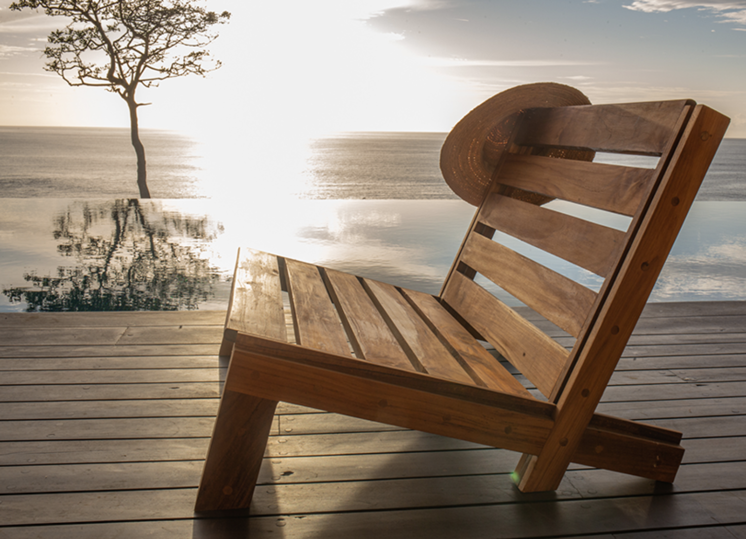 The interior design marries minimalism, rustic charm, and modernity, drawing inspiration from the nearby forests and beaches. The color palette and surfaces incorporate materials such as shells, rocks, and corals from Playa Puerto Escondido. Furniture is crafted from teak wood harvested locally as part of a reforestation program, and bamboo is used in the cantilever roof.