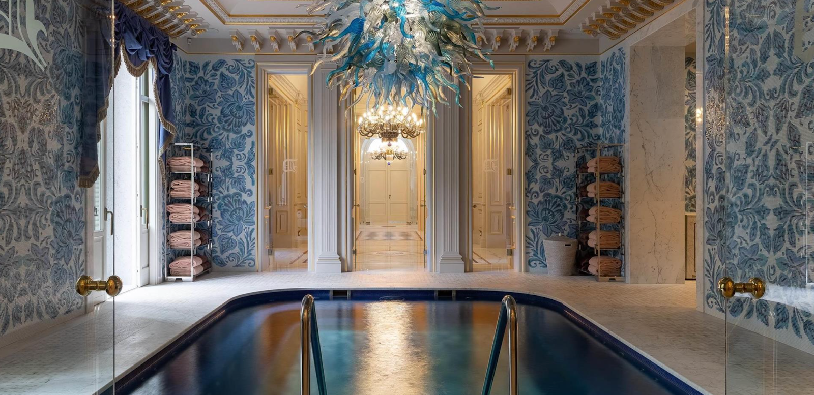 La Datcha boasts several elevated luxury features, each crafted with artisanal detail. The main hallway, leading to an enclosed swimming pool, is accentuated with a hand-blown glass chandelier by famed American glass artist Chihuly. Other notable elements include emperor chandeliers and hand-laid tile mosaics, symbolizing the theme of artisanal craftsmanship throughout the home.