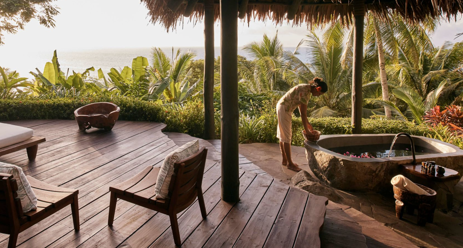 The resort features twenty-four private villas scattered throughout the island, designed by London designer Lynne Hunt and architect Steven Albert. The villas harmoniously blend traditional Fijian architecture with modern luxury. These structures utilize local materials such as thatch, volcanic stones, and Fijian handicrafts and offer natural ventilation and seclusion, significantly reducing the need for air conditioning while ensuring comfort and privacy. Each villa has a private pool, expansive outdoor living areas, and direct access to pristine beaches, offering an unparalleled luxury experience.