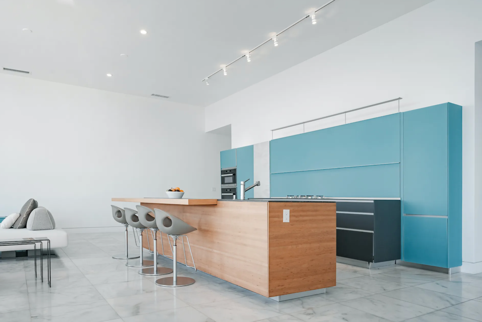 The villa's interior employs a minimal color palette to highlight the vibrant palette of the natural surroundings. Large windows allow sunlight to dance across the space, while pops of color, like the vibrant blue in the kitchen, mirror the ocean’s beauty, enhancing the guest experience.