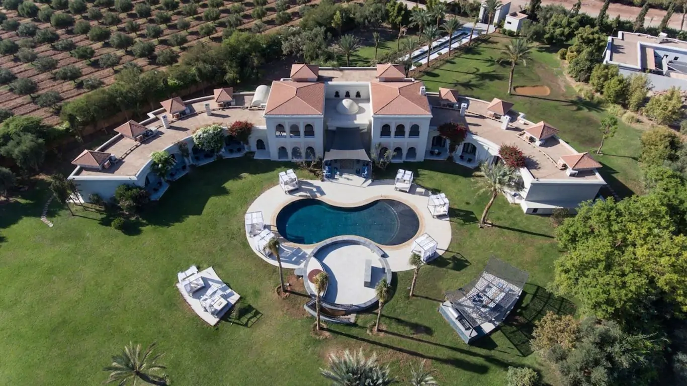 Eclectic furnishings blend Tinseltown glamor with retrofuturist influences, while artful gold goblets adorn the sitting room's sleek tray ceiling, creating an eccentric ambiance. The residence can accommodate 22 guests in 11 bedrooms. Guests indulge in wellness facilities, including fitness centers, massage rooms, and a hammam. Over three acres of terrain outdoors offer a jacuzzi and a mosaiced pool surrounded by day beds, manicured lawns, and gardens, providing enchanting spaces for Berber-inspired nights of luxury.