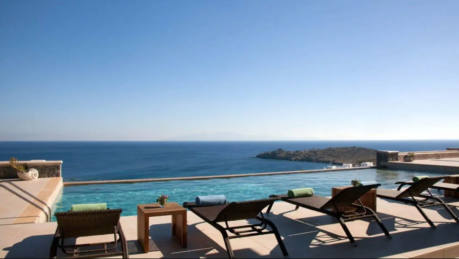 Outside, expansive decks offer panoramic Aegean views, shaded lounges, a lavish swimming pool, and additional amenities such as a grill area and sports court. Villa Arina is a perfect retreat for social gatherings or serene relaxation.