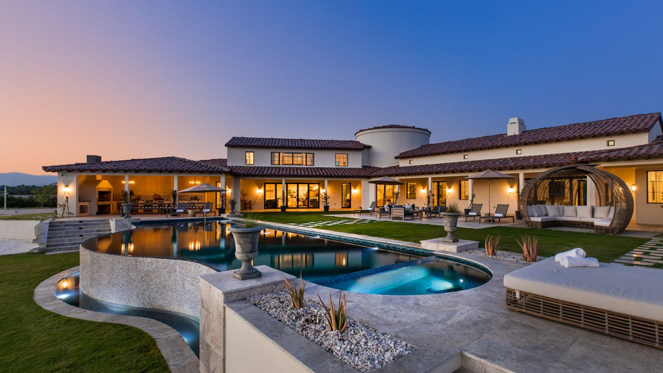 This Mediterranean-styled estate perched upon 20 sprawling acres is serene and stately and represents the epitome of Palm Springs highlife living. A hot tub and a firepit offer the ultimate respite from chilly evenings following picturesque sunsets over the Santa Rosa Mountains. Get lost in the panoramic views of the swaying palm trees before dipping into the infinity pool. A private lake presents further water recreation, while bocce and tennis courts are great for groups.