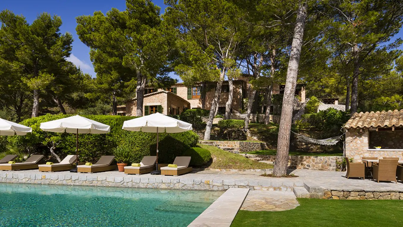 Son Bunyola is an idyllic place to stay on the Island of Mallorca, perched high in the hills. This secluded estate offers breathtaking views of the sealine and surrounding mountains, just moments away from the picturesque beaches. This pastoral complex comprises three separate homes, accommodating twenty-six guests in thirteen bedrooms. Each combines beachside romanticism and timeless elegance by having sloped ceilings, white interiors, and sofas, all bringing to life the airy ambiance, while warm wood details seamlessly rope together the indoor and outdoor areas. The bohemian atmosphere navigates around the estate, especially the vines embracing the manor walls and citrus and olive trees scattered throughout the garden. Son Bunyola is a perfect property to unwind with friends and family and enjoy the Balearic Islands.