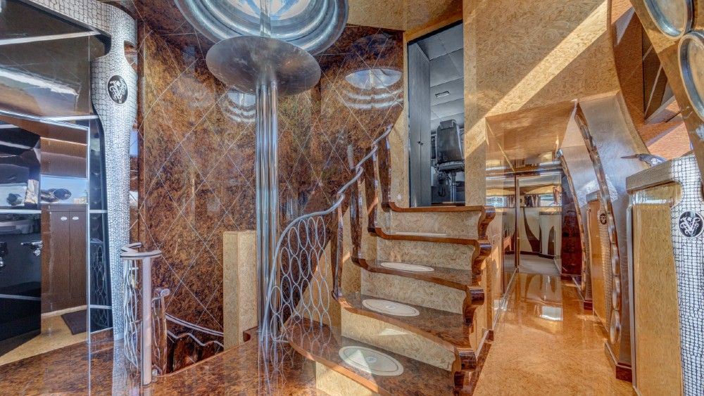 Interior spaces are lavishly decorated – inlaid rare woods varnished to mirror finishes; fixtures of polished pewter and gleaming chrome; overstuffed, uniquely-shaped furniture in velour and silk.