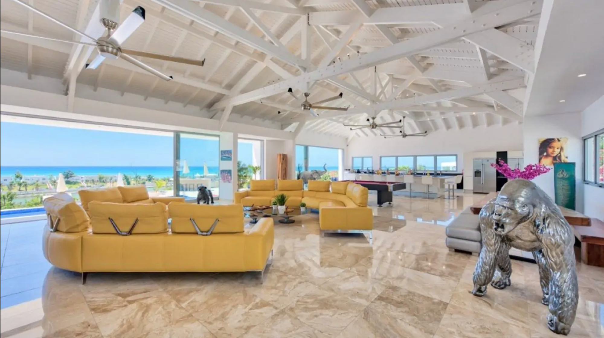 Villa Grande Azure, nestled in the prestigious Terres Basses of St. Martin, epitomizes luxury and glamor. Offering breathtaking sea views and proximity to sandy beaches, this two-acre estate ensures privacy and serenity for discerning guests. The great room impresses with its towering double-height ceiling and Caribbean ambiance, seamlessly integrating dining, living, and entertainment spaces adorned with vibrant decor. Five lavish bedrooms, each with private baths and stunning views, promise utmost discretion. The expansive deck, complete with a large freshwater pool and outdoor bar, sets the stage for exceptional entertainment, making Villa Grande Azure the pinnacle of St. Martin luxury retreats.