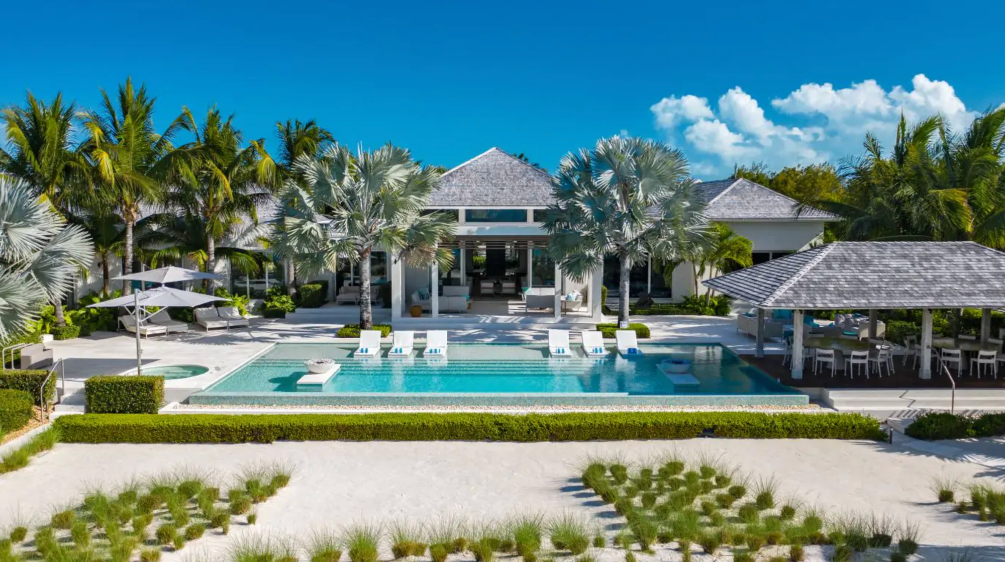 Villa Sentosa in Turks and Caicos offers resort-like exteriors designed for all-day entertaining, set against a backdrop of breathtaking natural beauty. The estate features an expansive pool deck, perfect for sun-soaked relaxation, alongside a chic cabana and a dedicated sunbathing platform. Soaring verandas invite guests to unwind in alluring seating arrangements while towering palms gently shade the crystalline waters of the infinity pool and Jacuzzi. This outdoor oasis is perfectly crafted for indulging in alfresco moments, particularly when bathed in the radiant hues of a Caribbean sunset. Every detail, from the lush greenery to the pristine architecture, harmonizes to create a luxurious atmosphere that appeals to affluent travelers. Villa Sentosa promises an unparalleled experience of tranquility and sophistication, making it an ideal retreat for those seeking lavish accommodations and exquisite outdoor leisure.