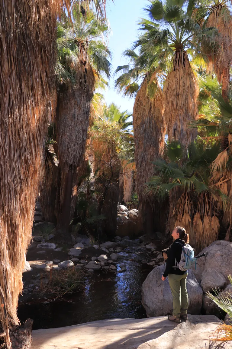 - Take a canyon hike to a waterfall. The Indian Canyons, at the south end of Palm Springs, is a popular protected nature sanctuary. Start out at Palm Canyon. This 15-mile long canyon, complete with a creek and waterfalls, is lined with large palm trees. In fact, the canyon is home to the world's largest grove of California fan palms. You’ll find a range of hiking trails of varying lengths and difficulties