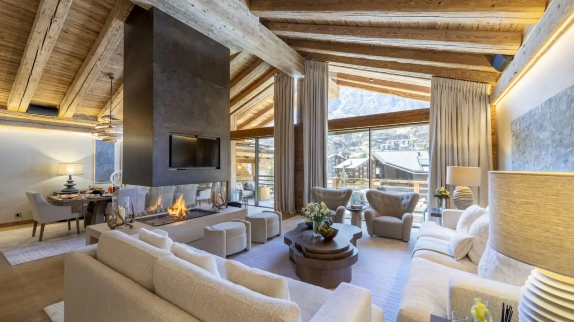 Chalet Elbrus is a luxury home rental in the heart of Zermatt, offering easy access to high-end fine dining, post-ski activities, and art galleries. The blend of modern chic design and genuine Alpine authenticity makes this chalet radiate both freshness and playfulness. It accommodates up to twelve guests, and it’s perfect for families, with four exceptional ensuite bedrooms and a whimsical children’s bunk room. Guests can indulge in the indoor hot tub, plunge pool, massage area, and sauna. At the same time, the gorgeous traditional balcony delivers breathtaking views of the village and Matterhorn, providing an ideal setting for serene relaxation.